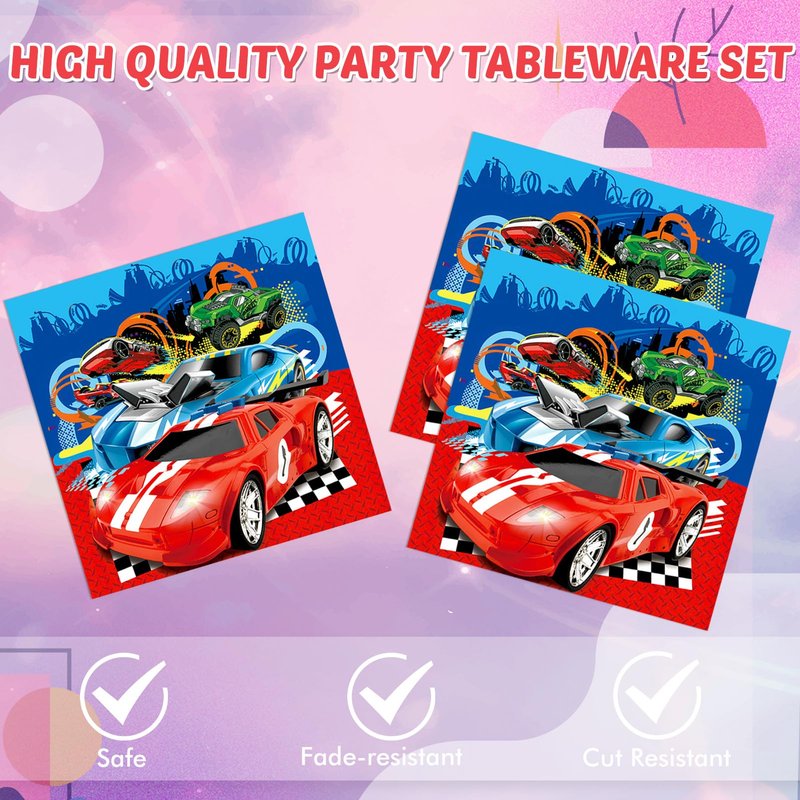 - šćRace Car Party Tablewareć These race car birthday party decorations including 20pcs racing car paper dessert plates 7", 20pcs racing car napkins 6.5" ,It's a great option for anyone who wants to throw an awesome race car birthday bash,let your friends and family at a enjoyable party have a great time.