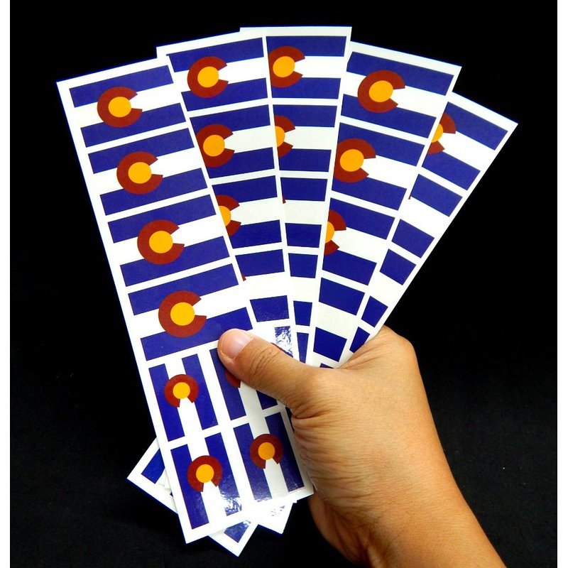 Each order = 5 sheets (40 temporary tattoos) featuring 8 Colorado State Flags (4 are 4.5 cm width, 4 are 3cm width.) Premium quality, rich colors last for days (depends on your skin). These are applied with water and are waterproof. Great for Colorado parties! Note the images above may be "mirrored". The flag will be backwards on the sheet; when you apply it to your body the image will flip and display properly.