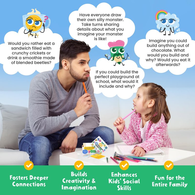 - UNLEASH FUN & CREATIVITY: Let laughter lead the way with 400 conversation starters for kids filled with playful questions, silly challenges, and interactive activities. This deck sparks imagination and brings out the joy in connecting with your kids. It encourages creativity, making every moment together feel special while offering a chance to learn unexpected things about each other.