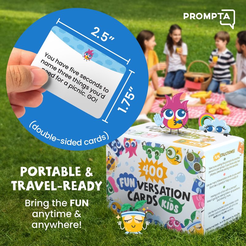 - PLAY ANYTIME, ANYWHERE: This super portable box containing 2.5" x 1.75" sized cards, fits easily into a purse or travel bag and is small enough to keep in your car. Inside, you'll find 324 quick-play questions that spark fun and connection, no matter where you are! Whether you have 2 minutes or 20, these small conversation starter cards for kids create big connections and lasting memories.