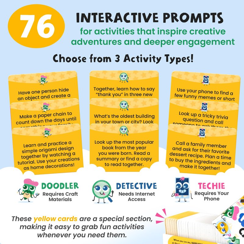 This isn’t just a conversation starter—76 of the prompts are interactive activities designed for deeper engagement. These prompts encourage collaboration and creativity, ranging from small hands-on projects to fun digital quests. Plan ahead and make these activities a highlight of your kids' week, turning every prompt into a memorable adventure!