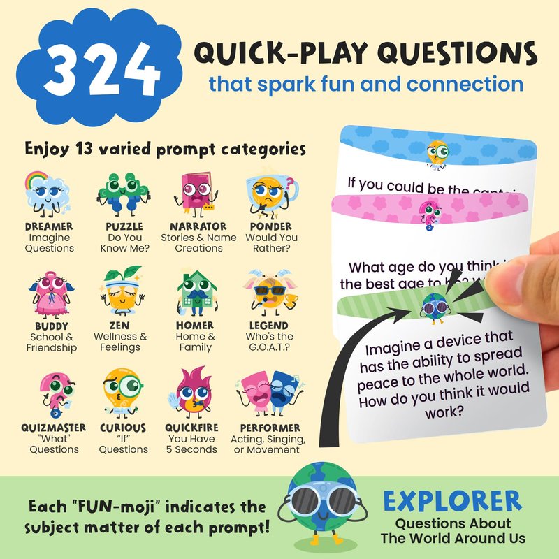 - ENGAGE THE WHOLE FAMILY: With 16 types of prompts, FUNversations are unlike other card games for kids as it offers something for everyone. Each category is marked by a cute FUNmoji graphic at the top of the cards. Use these playful graphics to navigate the different categories, making it easy to keep the experience lively and engaging. From storytelling and imaginative prompts to “How well do you know me?” questions, the variety ensures that every interaction remains fresh and entertaining. With this deck, there’s never a dull moment!
