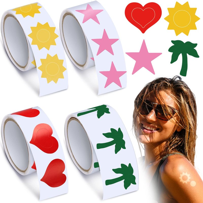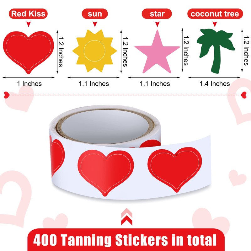 - Sufficient Quantity and Styles: you will receive 4 rolls of tanning stickers in 4 different patterns, including heart, sun, coconut tree and pentagram, 100 pieces for each roll and style, 400 pieces in total, measuring about 3 x 2 cm/ 1.2 x 0.8 inches of each, sufficient quantity, assorted styles, enough to meet your multiple daily use and replacement needs in summer time