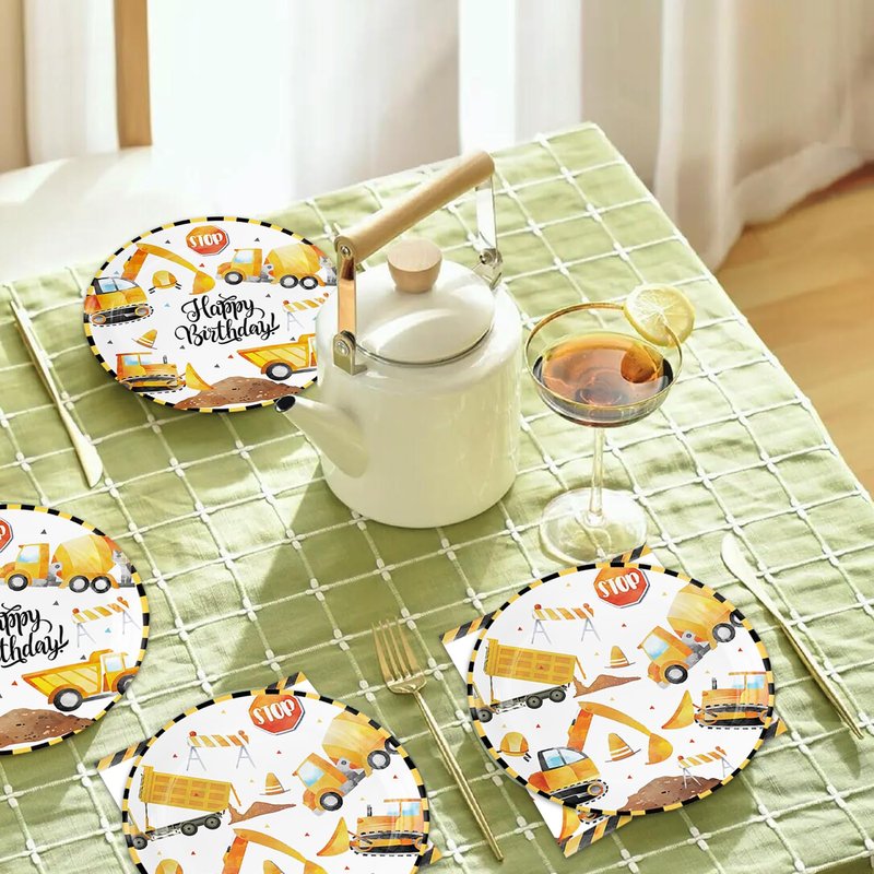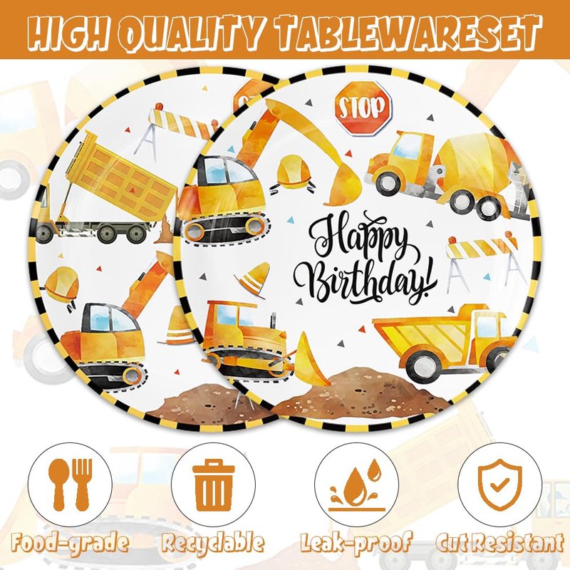 - 3.【User】: Construction children birthday party Supplies plates made of recyclable food grade Ivory paper. Very durable and safe, suitable for kids.children Plates each is 7 inch.