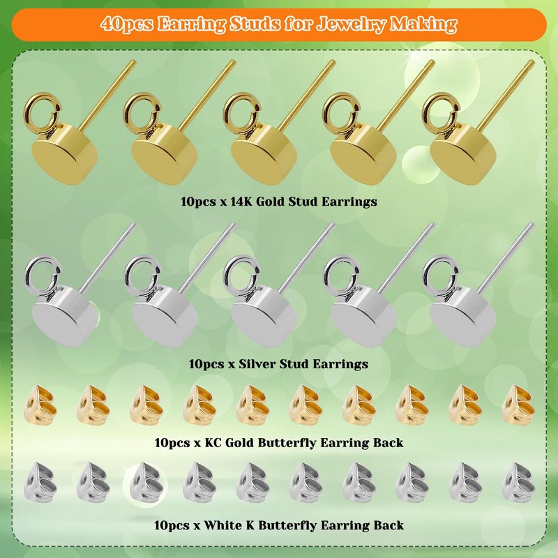 - 【Package Includes】The package contains 10pcs 14K Gold hypoallergenic stud earring,10pcs silver hypoallergenic stud earring,10pcs KC gold butterfly earring back,10pcs white K butterfly earring back.Sufficient quantity meet you daily earring making needs,you can also share them with your friends and family members.