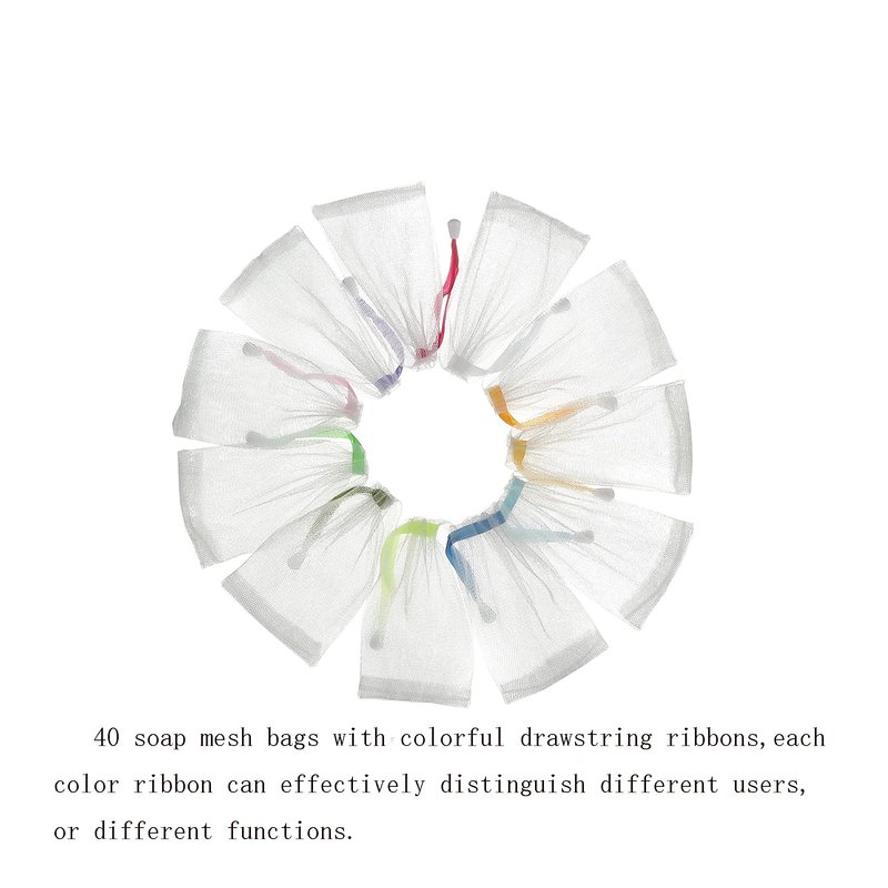 - You can get 40 mesh soap bags, 3 transparent hooks and 5 transparent spring cord plastic locks.Size: about 6.3 inch (length) * 3.9 inch (width); material: nylon; mesh bag color: white; ribbon color: red, yellow, blue, green, white, purple, orange, pink, light blue, a total of 10 colors, sent randomly, each color ribbon can effectively distinguish different users, or different functions.