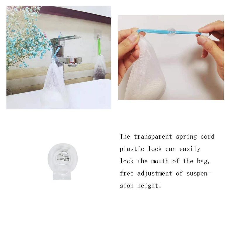 - Double layer soap net is very easy to use. You just need to put the soap into the bag, and then pull on the pull rope. The transparent spring cord plastic lock can easily lock the mouth of the bag, so you don't worry that the soap may fall off when you use it. The transparent hook allows you to freely design the hanging style and stick it in your favorite position. The mesh soap bag with lock catch and drawcord can be easily hung, which is easy to dry the soap and save the soap more effectively.