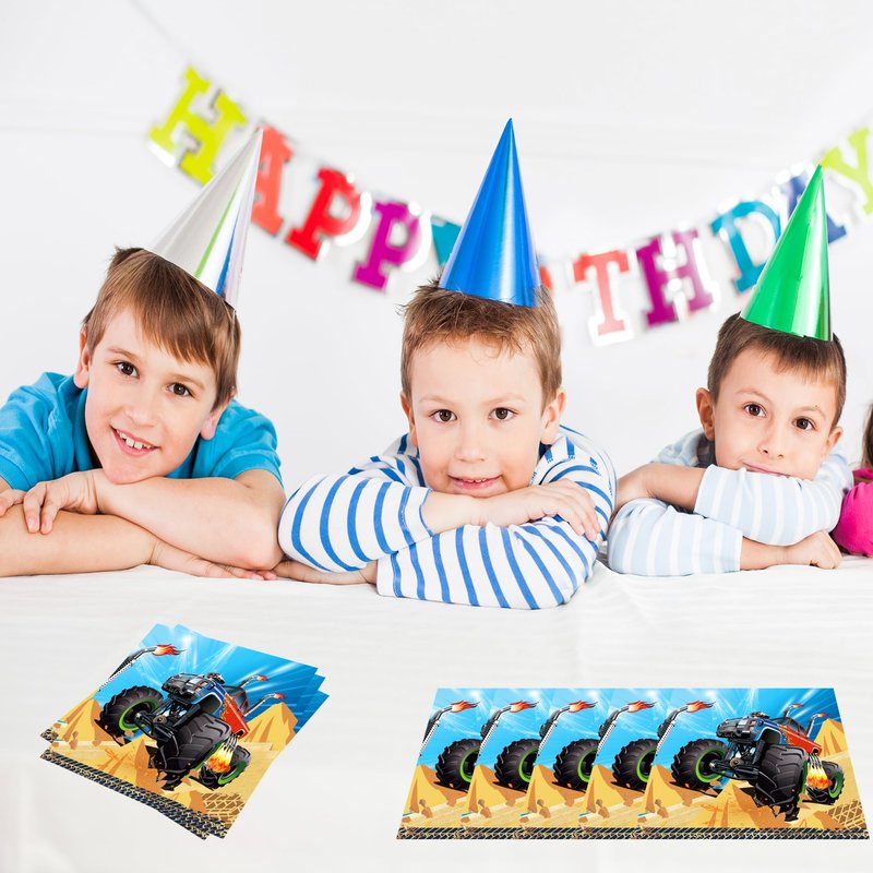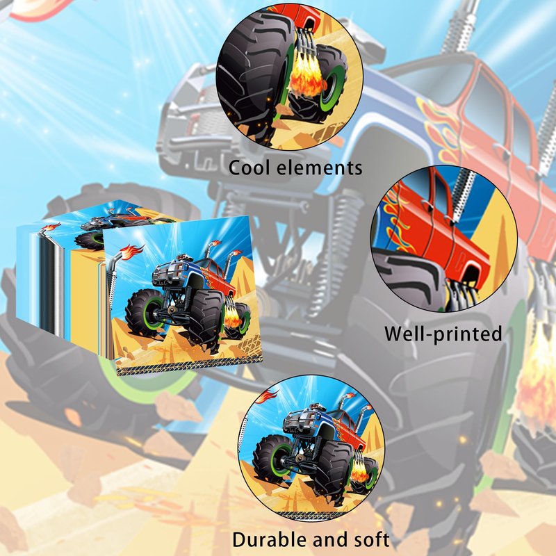 - 【Happy Monster Truck】: Introducing our 40-piece Monster Truck paper napkins set, perfect for any Monster Truck gathering. These napkins feature a beautiful Monster Truck design that will impress your guests and add a touch of elegance to your table setting. Made of high-quality paper, these napkins are disposable for easy cleanup. Use them as guest napkins or for your own Monster Truck theme, and let the theme create a warm and inviting atmosphere. Elevate your next party with our party napkins, designed for the ultimate Monster Truck experience.