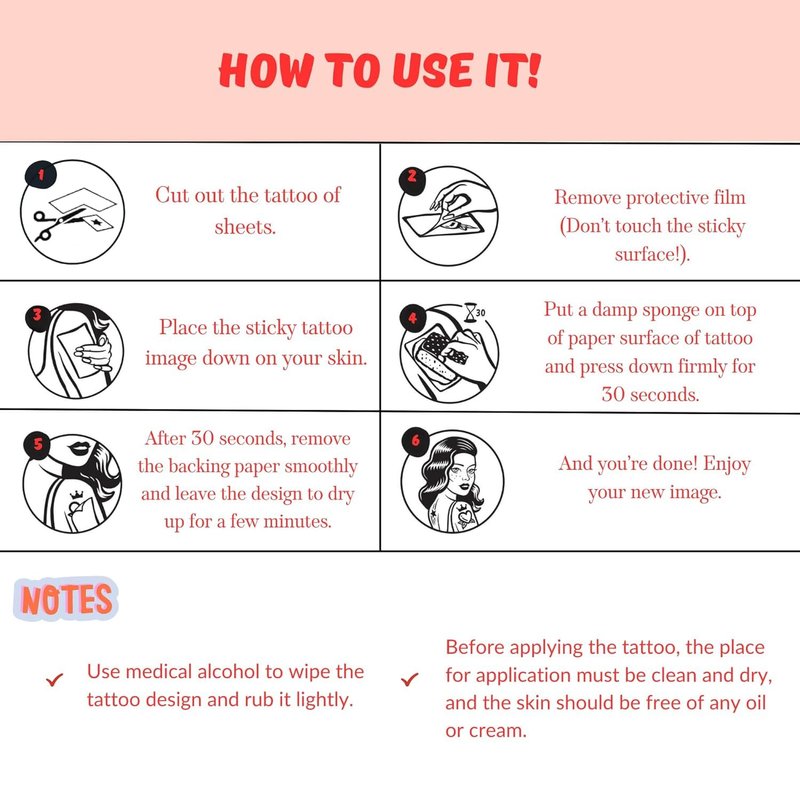 How to use: Cut out the desired pattern, wipe the back of the tattoo with a damp cloth or sponge for 30 seconds, then remove and you're done.