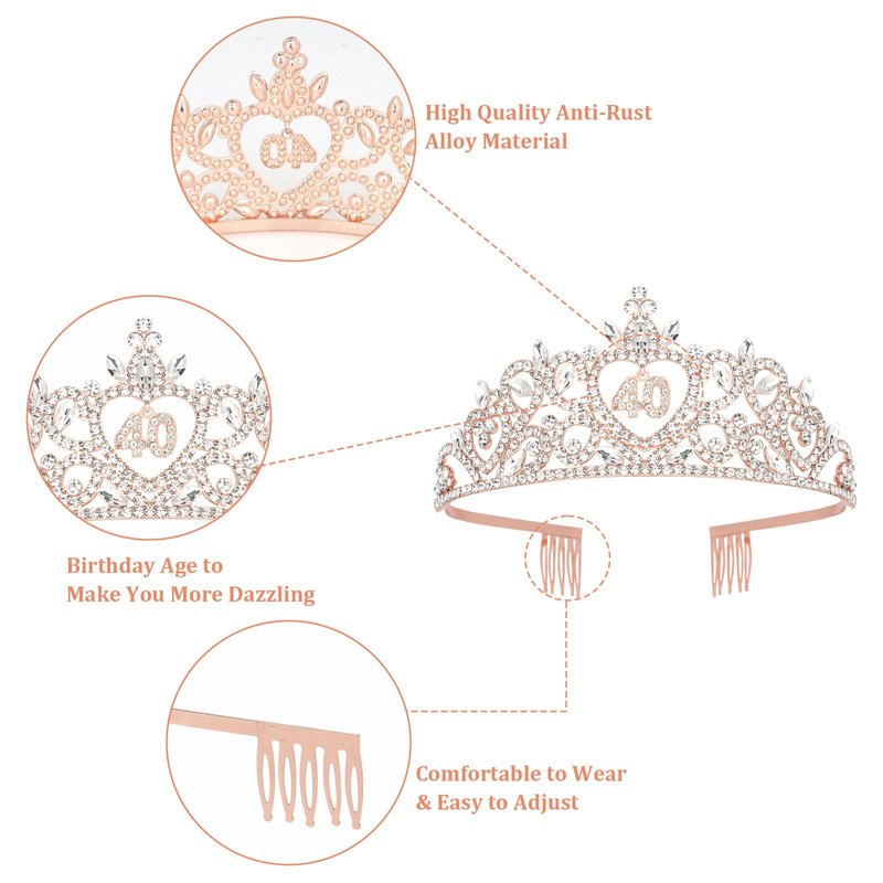 - Comfortable to Wear: The width of the 40 birthday tiara for women can be adjusted according to the shape of your head, The birthday crowns for women size is: 2.36*5.31 inch, one size fits most head sizes. In addition, the smooth edge will not squeeze the skin and is very comfortable to wear. It won't come off easily even when dancing at a party.