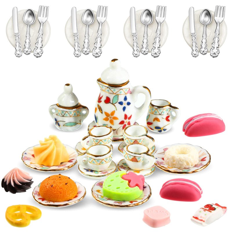 - Fit combination: you will receive 15 pieces of porcelain tea cups, 16 pieces of mini doll plates knifes forks spoons, each has 4 pieces, and there also are 10 pieces of miniature decor dessert pastry cakes for you; The rich quantity can meet your DIY and creation needs, you can also share them with your friends