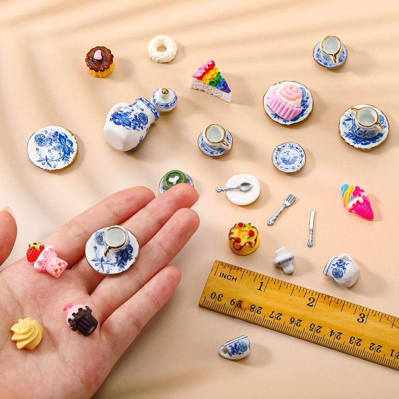 - Fit combination: you will receive 15 pieces of porcelain tea cups, 16 pieces of mini doll plates knifes forks spoons, each has 4 pieces, and there also are 10 pieces of miniature decor dessert pastry cakes for you; The rich quantity can meet your DIY and creation needs, you can also share them with your friends
