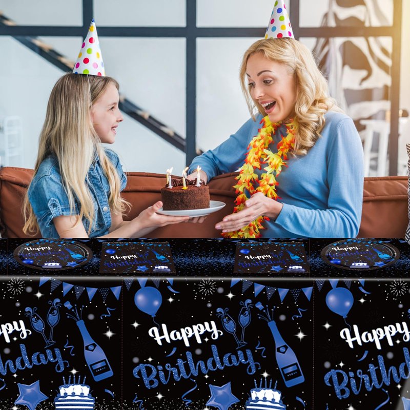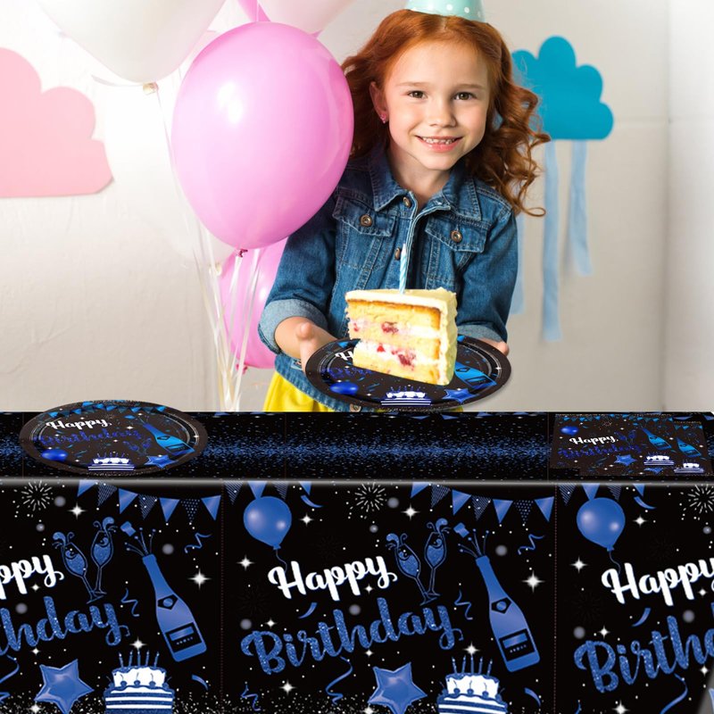 - Happy Birthday Party Supplies: Our blue and black birthday decorations includes 20 pieces happy birthday plates, 20 pieces happy birthday napkins, 1 pieces happy birthday tablecloth. Happy birthday decorations will give you a perfect birthday party memory.