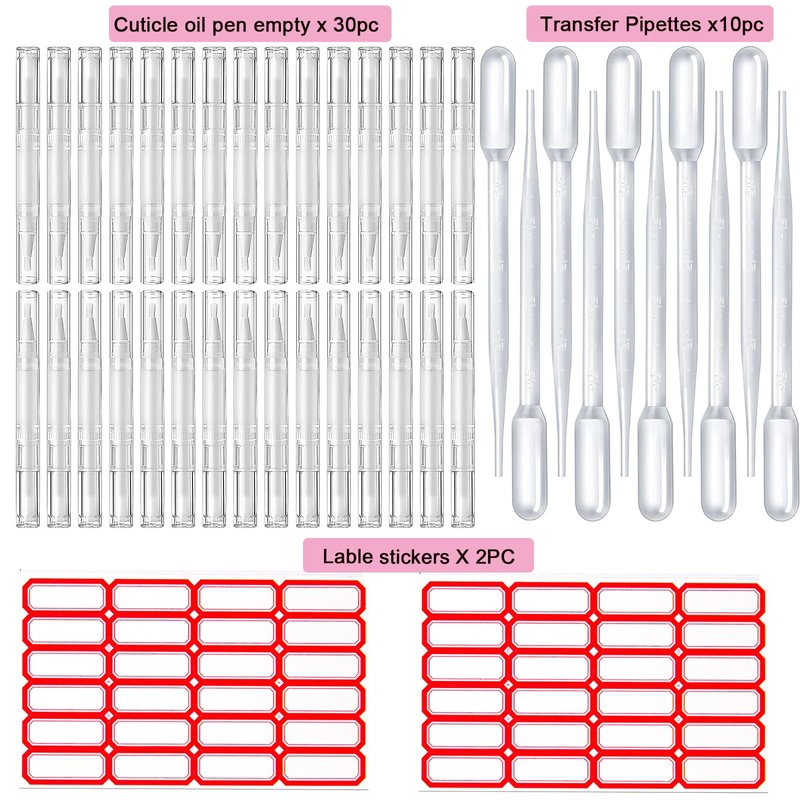 - 【42pcs Empty Cuticle Oil Pen Set】: The empty cuticle oil pen set includes 30 pcs transparent twist pens, 10pcs Transfer pipettes, 2pcs Label stickers. Each tube's capacity is 3ml. Sufficient quantity can meet your different purposes, suitable for travel, business trip, daily use, replacement, or share with your family members or friends, etc