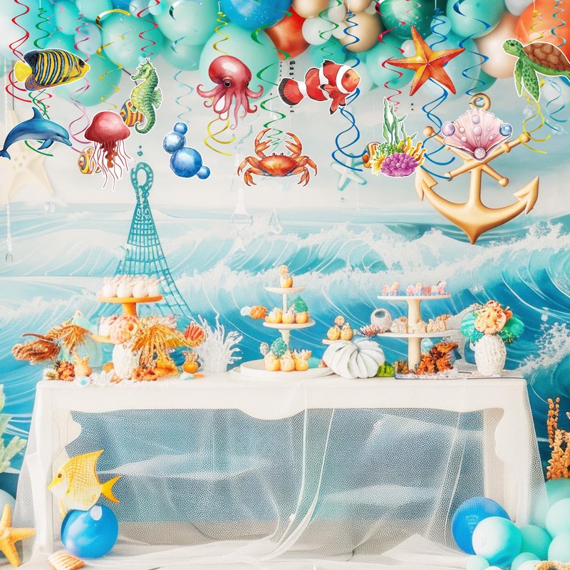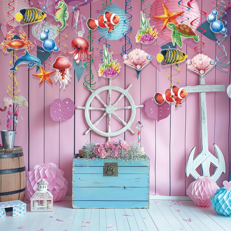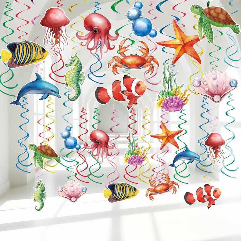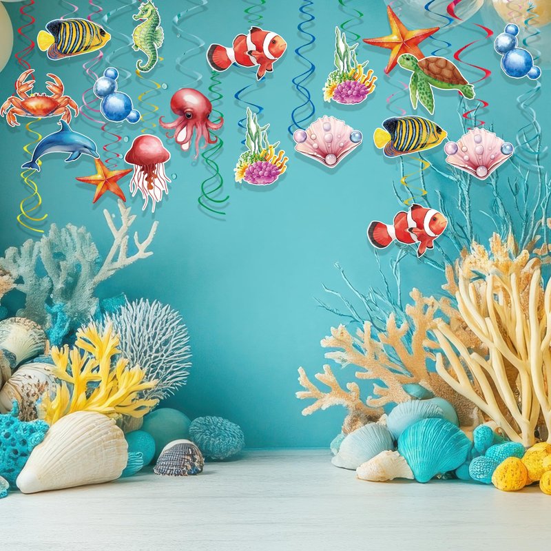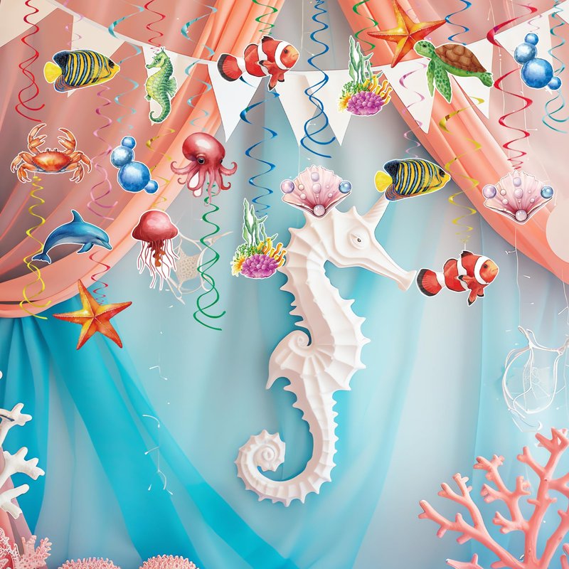 Tropical fish hanging swirl decoration design combines crabs, turtles, starfish, seahorses, octopus, seaweed, seashells and other elements, which will surely add a sense of ambience to your party and create a vibrant mini ocean world.