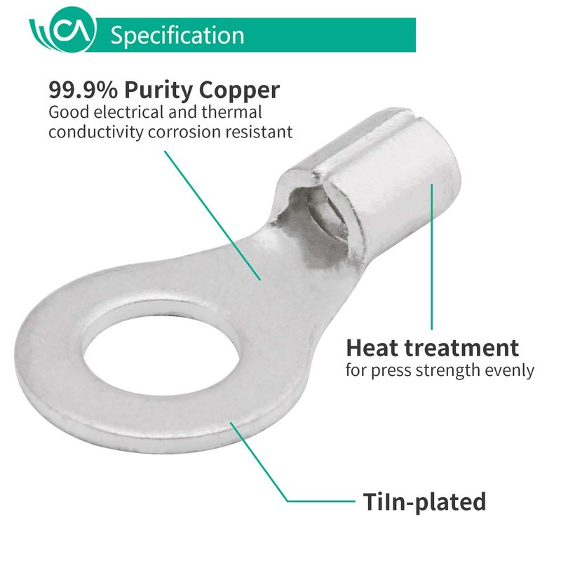 - Non insulated ring terminals high quality gurantee: producted under UL standard;High corrosion resistance;silver welding wire thickness: Comply with international standard,High temperature battery terminal connectors resistant heavy ring connector.Copper content ≥ 99%, conductivity ≥ 96%, high conductivity, ductility and corrosion resistance,It's a good helper for wire connection