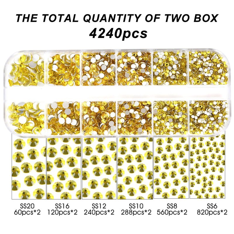 4240Pcs Flatback Yellow Rhinestones Glass Crystal Diamonds for Nail Art Crafts Tumblers Shiny Round with Tweezers and Picking Pen (SS6~SS20 Set)