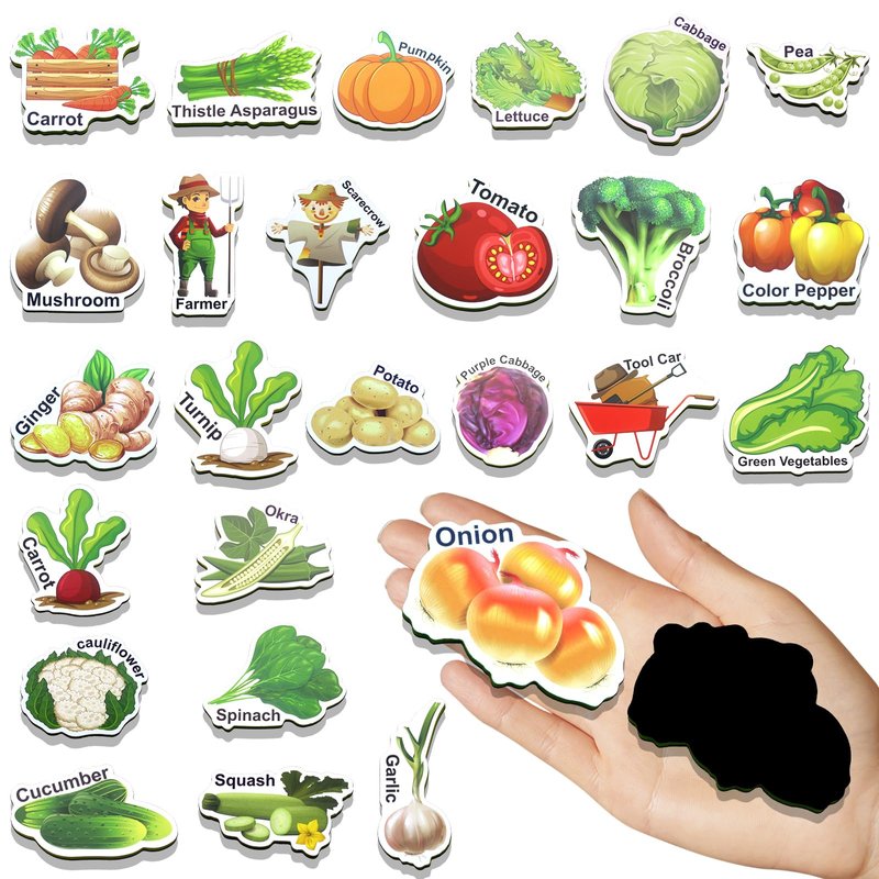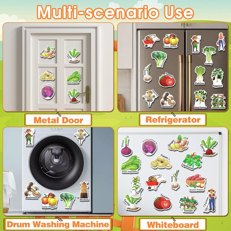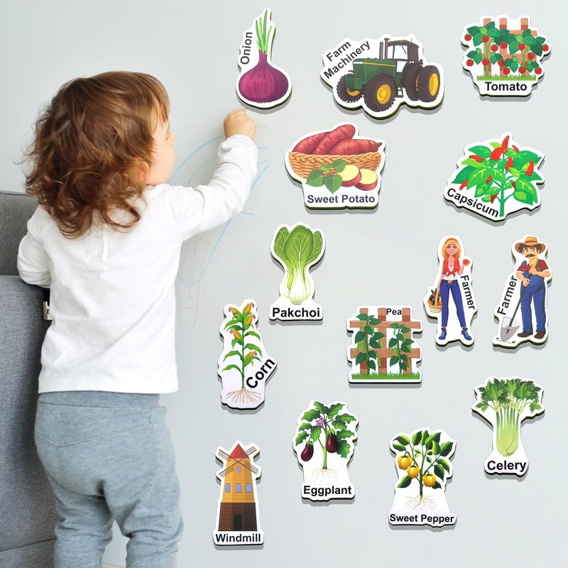 - Farm Theme Fridge Magnets: This fridge magnets set is designed in the style of a Farm and contains 42 distinctive patterns, 33 of which are common vegetables found on the dinner table, 4 adorable farmer magnets, as well as 2 agricultural work trucks, a scarecrow, a bag of fertilizer and a windmill.