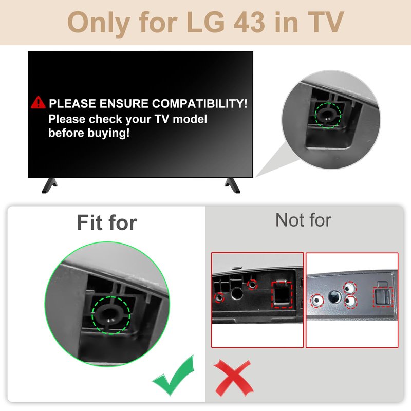 Base stand leg only for lg tv stand replacement base Compatible Models: 43 INCH: LJ Series - 43LJ5500 43LJ550M 43LJ5550 43LJ5500UA UJ Series - 43UJ6300 43UJ6300PUA 43UJ630T 43UJ635T UK Series - 43UK6200 43UK6090 43UK6200PUA 43UK6200PLA 43UK6090PUA 43UK6500PLA 43UK6500LLA 43UK6500MLA 43UK6500AUA UM Series - 43UM6900PUA 43UM7100PUA 43UM7300PUA 43UM7300AUE 43UM7310PUA 43UM6950DUB UN Series - 43UN7300PUF 43UN7300PUC 43UN7300AUD 43UN7300PUD 43UN7100PUA 43UN6900PUB Features: 1. With Screws and Instructions: Our TV stand for lg tv legs 65 inch comes with screws and instructions. You can install the new TV stand leg with screws, easy and quick. 2. No Need to Drill Holes: The tv feet replacement is used under the TV, you don't need to damage your wall. Just use the TV stand legs, protect your beautiful wall and enjoy watching. Package List: 1 x stand for LG TV 1 x Screw set 1 x Instructions