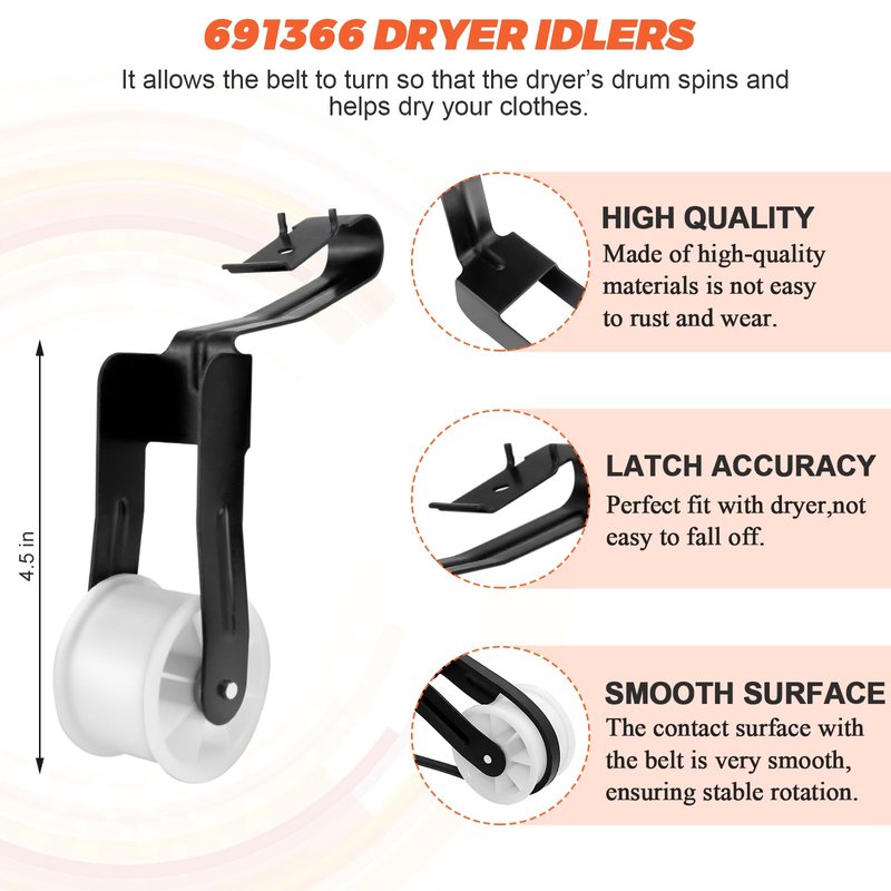 - ✅【4392065 Dryer Repair Kit】:4392065 Dryer Repair Kit for 29" wide dryers with the lint filter located on the top of the dryer.▶691366 Idler Pulley sits between the motor and drum to keep tension on the drive belt. It allows the belt to turn so that the dryer’s drum spins and helps dry your clothes.▶341241 Dryer Drum Belt attaches to the drum, idler pulley, and motor pulley. As the armature of the motor rotates, the belt begins to move and turns the drum. This belt features 4 ribs and 3 grooves.