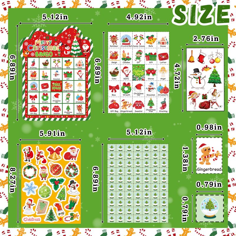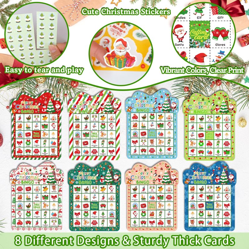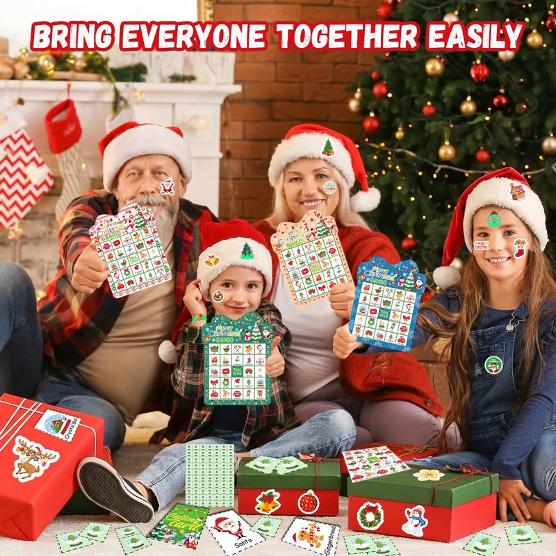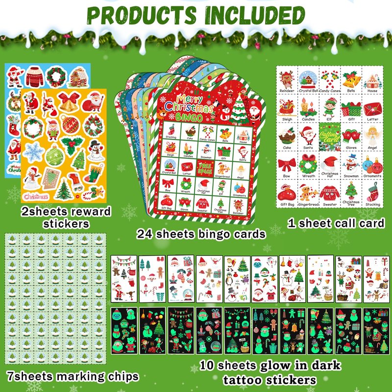 - 【Christmas Bingo Games Package Include】:This Christmas bingo games for large group set includes 24 pcs different player Christmas bingo cards, 26 pcs well-designed calling cards, 490 pcs marking cards and 40 pcs unique reward stickers, 10 sheets glow in dark tattoo stickers(Include 95 pcs different patterns), Christmas bingo cards set can provide 24 people to play together and accommodate all family members or party members to play Bingo game together.