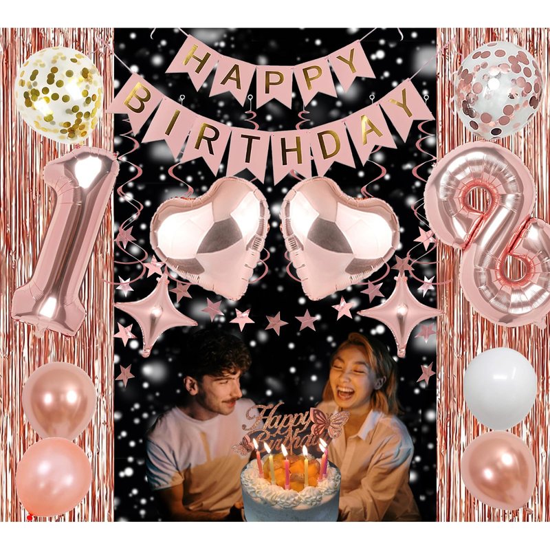 • Rose Gold Birthday Decorations Set: Includes 39*79in rose gold metallic tinsel fringe curtains*2, 32in number foil balloons*2, paper ‘happy birthday’ banner *1, 12in confetti balloons (rose gold*6, gold*6), 10in balloons (metallic rose gold*6, metallic gold*6, rose gold*6, white*6), 18in rose gold heart foil balloons*2, 10in star foil balloons*2, mirror star streamers garland*1, hanging swirls*1, cake topper*1, 2pcs balloon tools