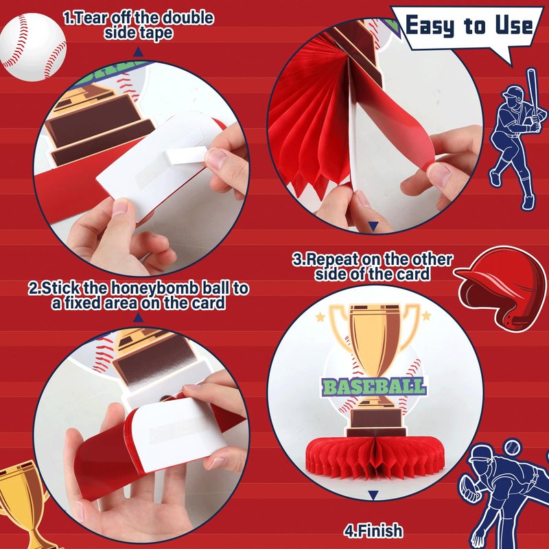• Package includes: Our product includes 2 pcs pre-assembled “happy birthday” banner, 12 pcs baseball themed cards, 6 pcs baseball honeycomb balls centerpieces and 12 pcs colorful foil swirl decorations. Each card is exquisite and can create a very strong atmosphere for our party.