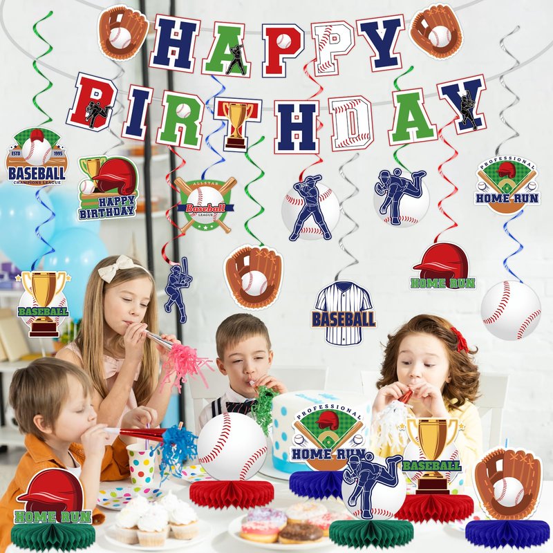 44 Pcs Baseball Party Decorations Happy Birthday Banner Sports Theme Hanging Swirls and Honeycomb Centerpieces Baseball Birthday and Gameday Celebration Decors for Kids Boys Baby Shower Party Supplies