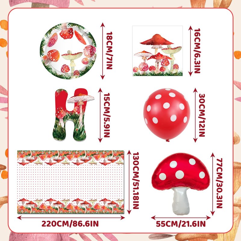 - Mushroom Party Package: Our mushroom party decorations include 1 pcs mushroom happy birthday Banner, 1 pcs mushroom tablecloth, 2 pcs big foil mushroom balloons, 12 pcs latex mushroom balloons(12 inch), 8 pcs mushroom dessert plates(7 inch), 20 pcs mushroom napkins, there are 44 pieces of decorations in total, a sufficient quantity is enough to meet your party decorations needs