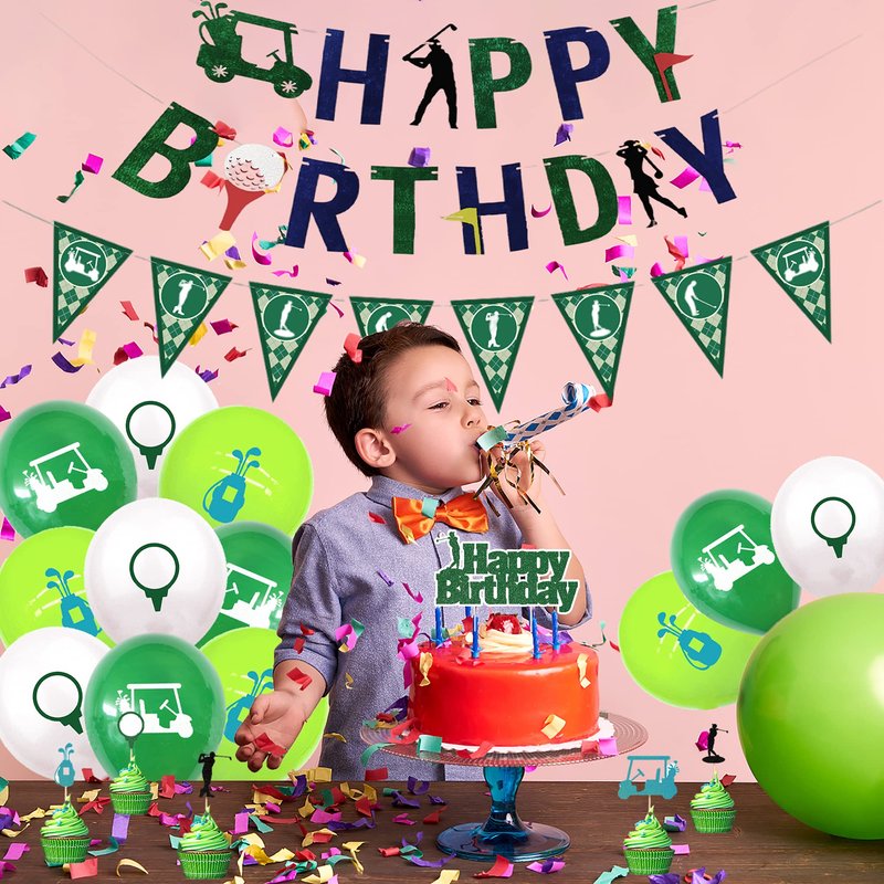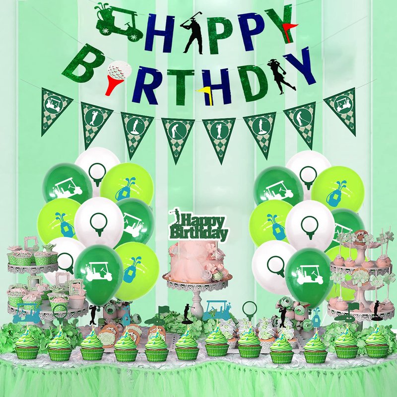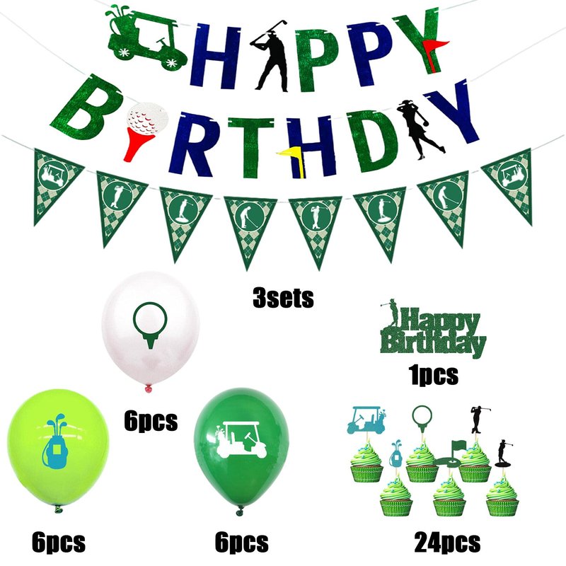 - PACKAGE INCLUDES: 1 set golf birthday banner, 1 pcs golf cake topper,1 set golf pennant bunting, 24 pcs golf cupcake toppers and 18 pcs latex balloons.