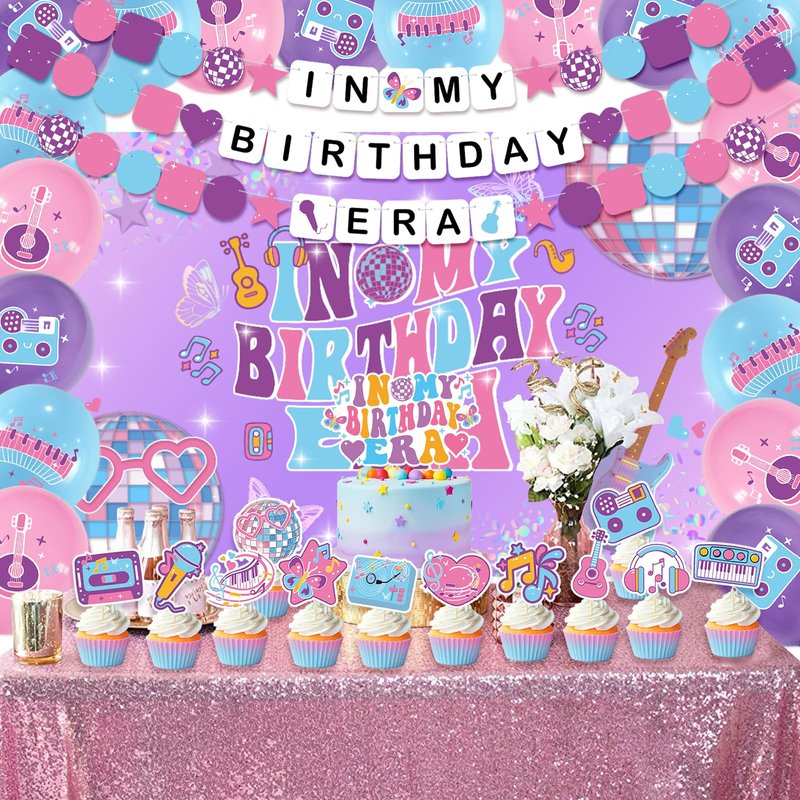 - 【What You Will Get】: Our In My Birthday Era party decoration set includes 1pcs happy birthday banner, 1pcs backdrop, 1pcs cake topper, 12pcs cupcake toppers,18pcs latex balloons.