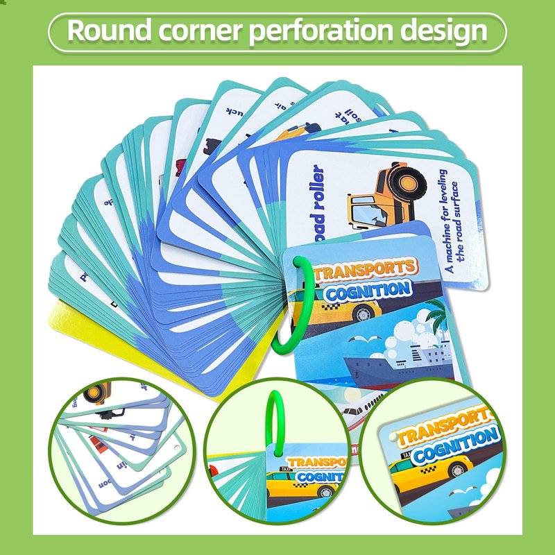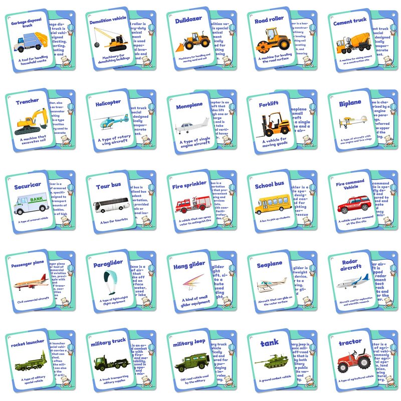 - 【Cognitive Picture Cards】: These flash cards are designed for children aged 3 and up, with 46 cards in total, including different types of construction vehicles, such as excavators, bulldozers, cranes, trucks, buses, trains, airplanes, boats, helicopters, and more. Each card features a vivid and colorful image of the construction vehicle, along with its name and a brief description. The cards are also equipped with a sturdy plastic ring, making them easy for children to hold and flip.