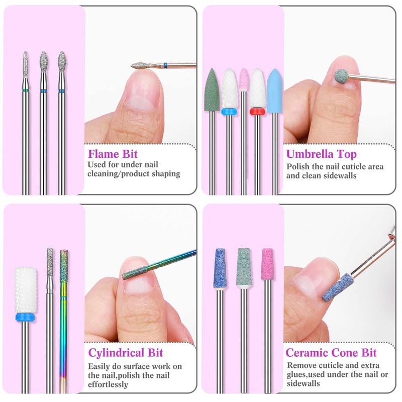 - Quality Materials: these nail bits for nail drill are made of quality ceramic and diamonds materials, with strength, durability and cutting performance; Moreover, ceramic materials produce less dust, friction and heat when applied, so they are ideal tools for manicure