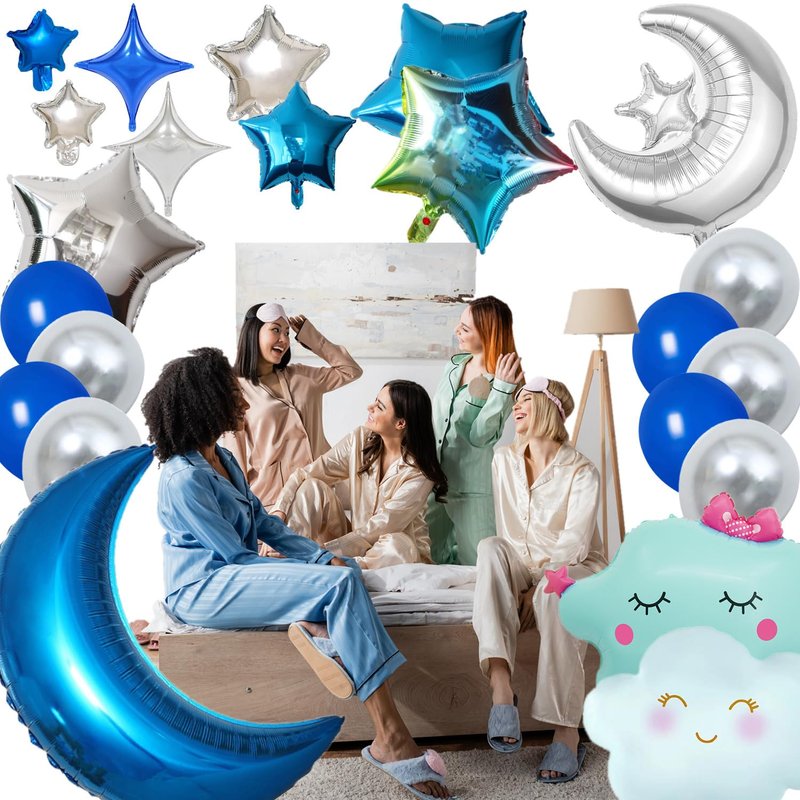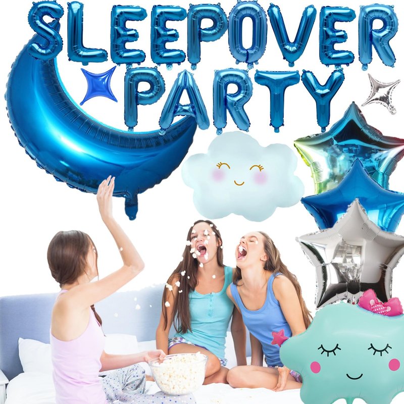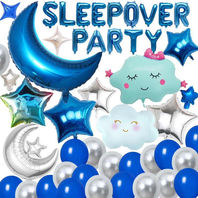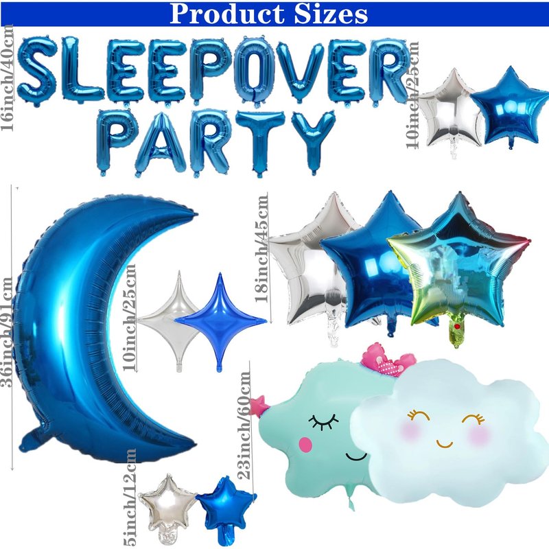 - SLEEPOVER PARTY Decorations: 1 set 16inch "Sleepover Party" balloons banner, 12 pcs different sizes star aluminum film balloons, 1 pc large 36 inch blue Moon, 20 pcs 10 inch blue and silver balloons for sleepover parties, slumber parties, slumber parties, spa parties!