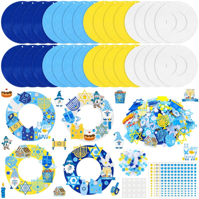 - Sufficient Quantity: Hanukkah wreath craft kits include 32 Hanukkah wreath, 32 ribbons, 140 felt adhesive stickers, 160 different printing patterns felt adhesive stickers, 100 balls, 3 diamond stickers, 5 adhesive, sufficient quantity to meet your decorating needs