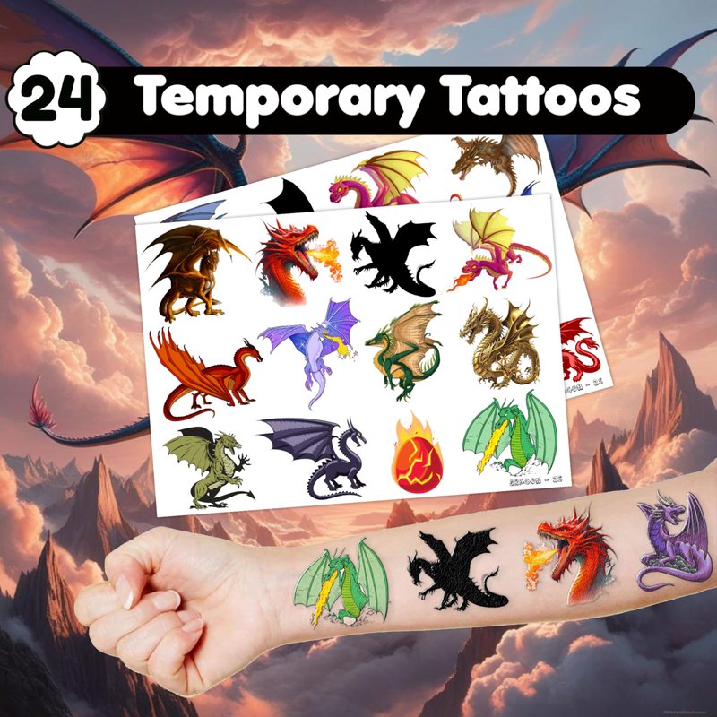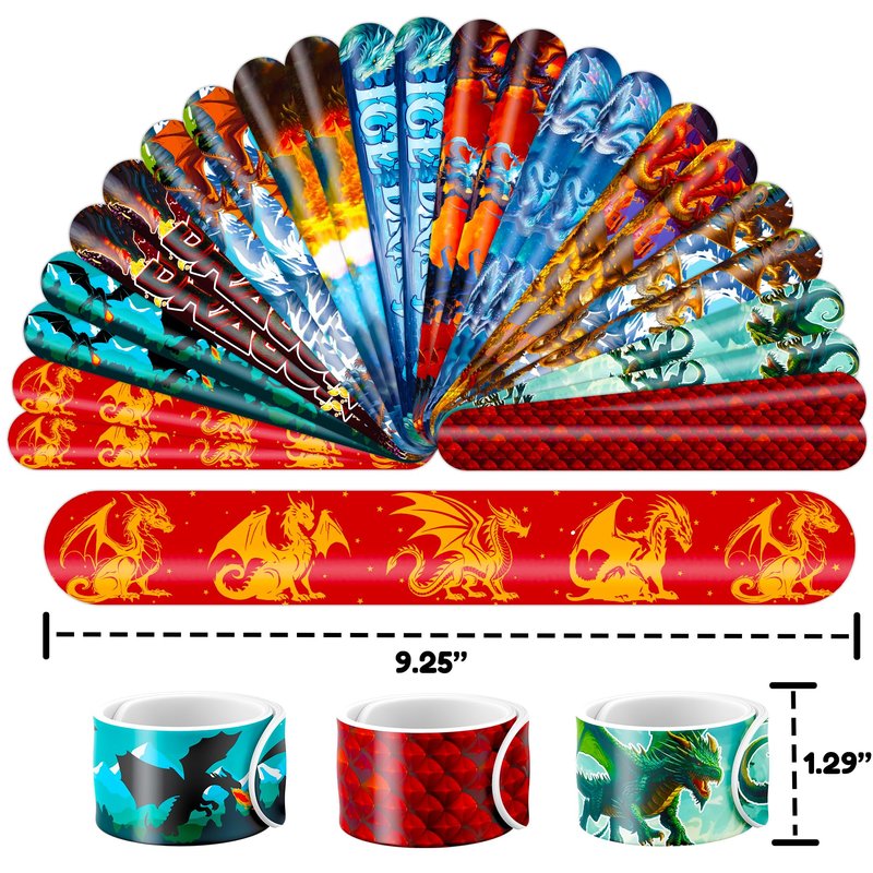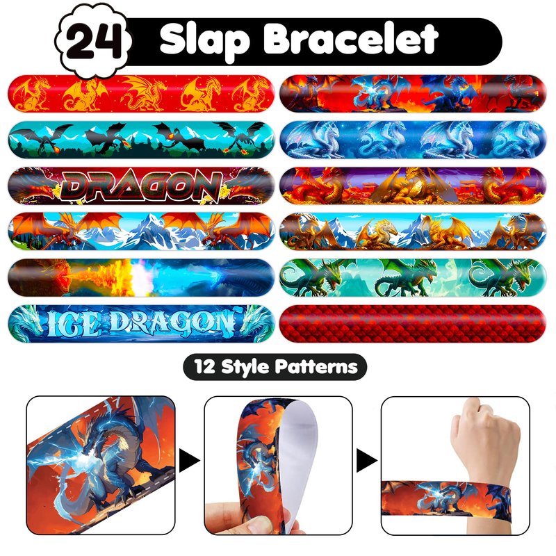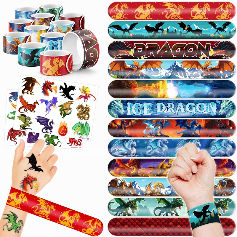 - šćPERFECT GIFT FOR DRAGON ENTHUSIASTSć: Our Dragon Temporary Tattoos and Slap Bracelets are the perfect gift for people of all ages, from kids to adults. Suitable for any occasion, they offer an affordable and delightful option. Whether for school events, birthdays, or stocking stuffers, this Dragon themed collection adds a fashionable and nostalgic element to anyone's accessory collection, invoking happiness and cherished memories.