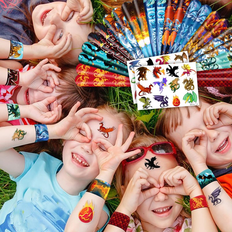 - Style: Dragon temporary tattoos; Dragon party favors; Dragon birthday party supplies; Dragon birthday decorations; Dragon slap bracelets