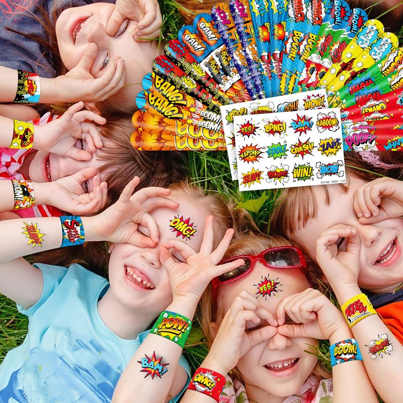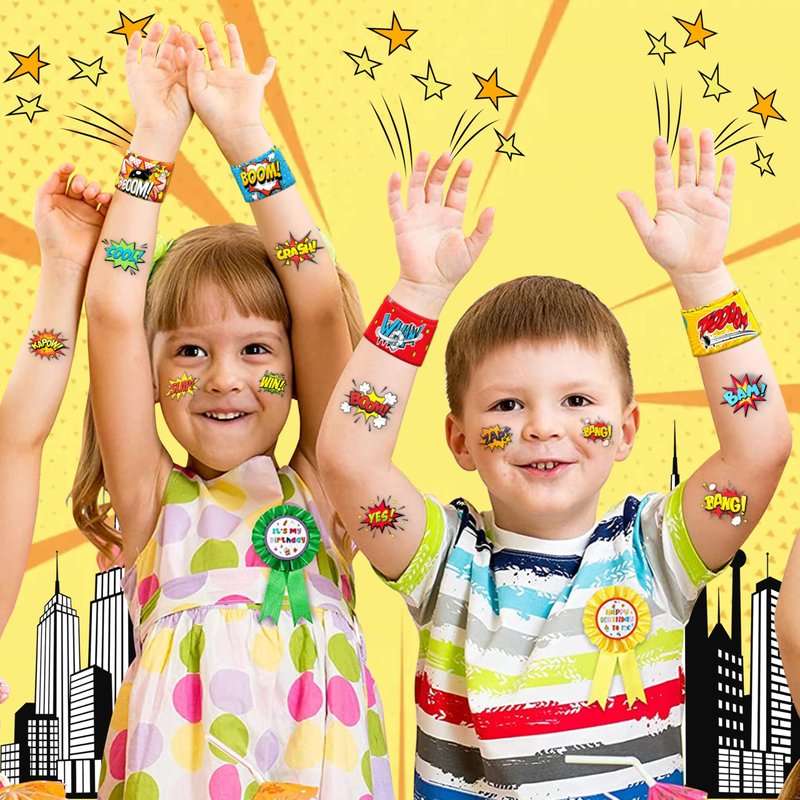 - šćPERFECT GIFT FOR HERO ENTHUSIASTSć: Our Hero Temporary Tattoos and Slap Bracelets are the perfect gift for people of all ages, from kids to adults. Suitable for any occasion, they offer an affordable and delightful option. Whether for school events, birthdays, or stocking stuffers, this Hero themed collection adds a fashionable and nostalgic element to anyone's accessory collection, invoking happiness and cherished memories.