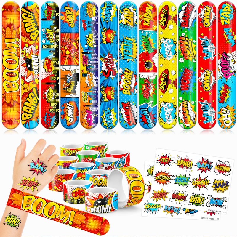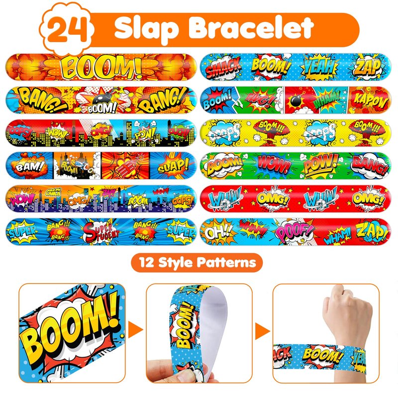 - š„³ćDELIGHTFUL HERO PARTY FAVORS BUNDLEć: Get ready for laughter with our set of 24 temporary tattoo stickers and 24 slap bracelets. Each piece showcases vibrant and adorable designs inspired by the Hero theme. Perfect for both kids and adults, this bundle ensures endless fun. The bracelets measure 23.5cm x 3.3cm, providing a satisfying "slapping" experience as they effortlessly wrap around your wrist.