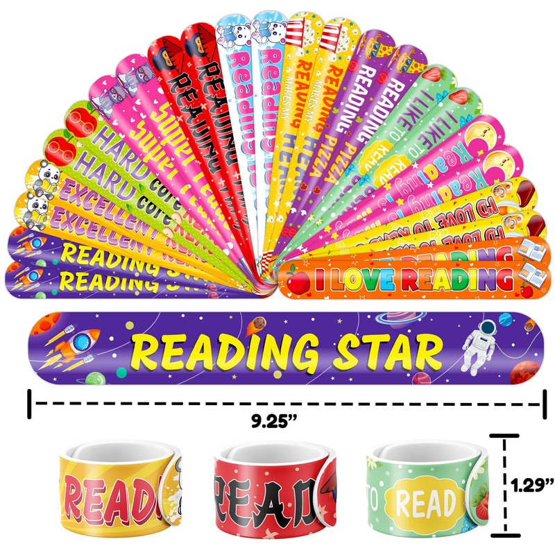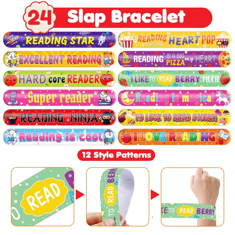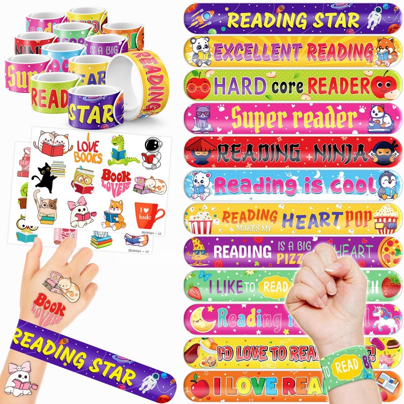 - š„³ćDELIGHTFUL LOVE TO READ PARTY FAVORS BUNDLEć: Get ready for laughter with our set of 24 temporary tattoo stickers and 24 slap bracelets. Each piece showcases vibrant and adorable designs inspired by the Love to Read theme. Perfect for both kids and adults, this bundle ensures endless fun. The bracelets measure 23.5cm x 3.3cm, providing a satisfying "slapping" experience as they effortlessly wrap around your wrist.
