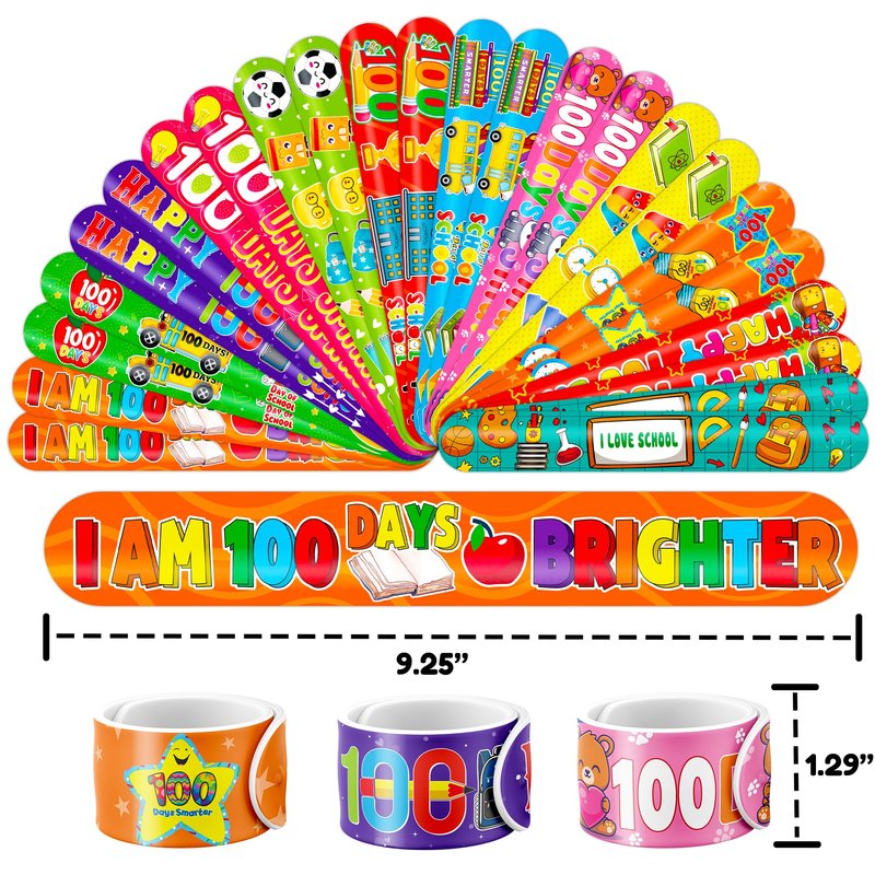- š„³ćDELIGHTFUL 100 DAYS OF SCHOOL PARTY FAVORS BUNDLEć: Get ready for laughter with our set of 24 temporary tattoo stickers and 24 slap bracelets. Each piece showcases vibrant and adorable designs inspired by the 100 Days of school theme. Perfect for both kids and adults, this bundle ensures endless fun. The bracelets measure 23.5cm x 3.3cm, providing a satisfying "slapping" experience as they effortlessly wrap around your wrist.