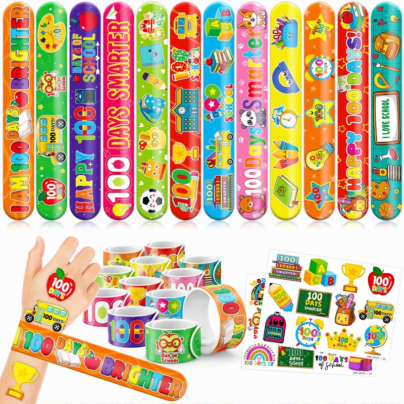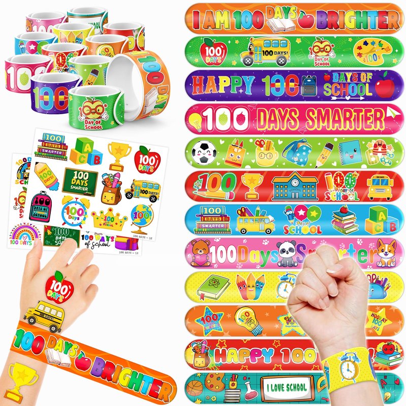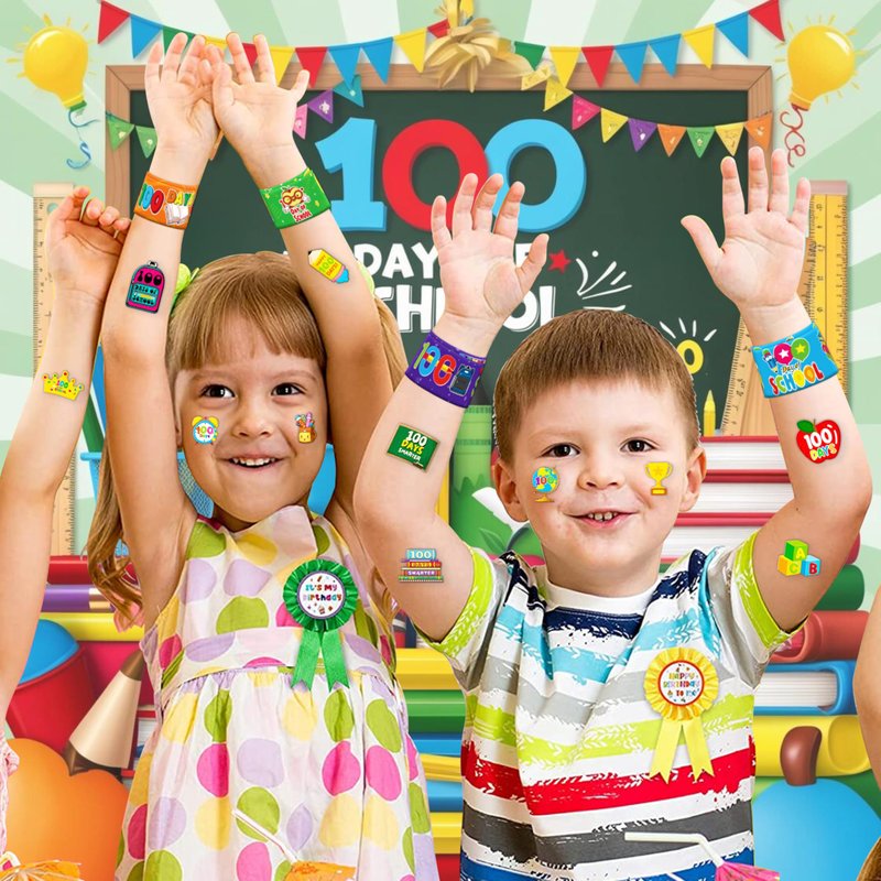 - šćPERFECT GIFT FOR 100 DAYS OF SCHOOL ENTHUSIASTSć: Our 100 Days of school Temporary Tattoos and Slap Bracelets are the perfect gift for people of all ages, from kids to adults. Suitable for any occasion, they offer an affordable and delightful option. Whether for school events, birthdays, or stocking stuffers, this 100 Days of school themed collection adds a fashionable and nostalgic element to anyone's accessory collection, invoking happiness and cherished memories.