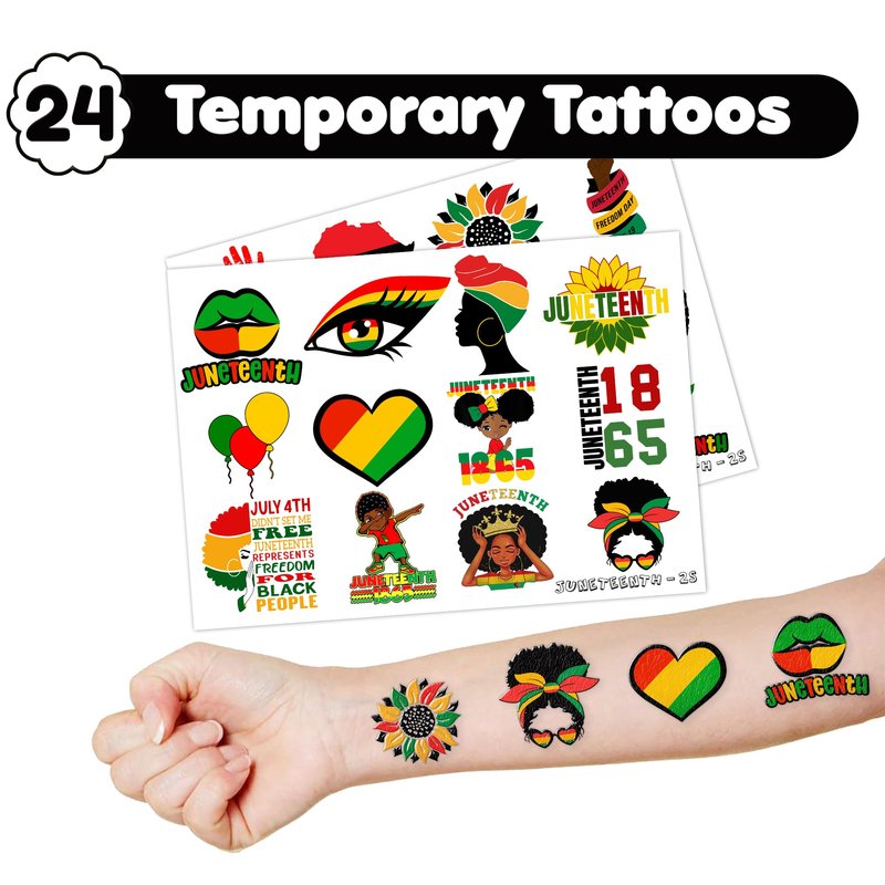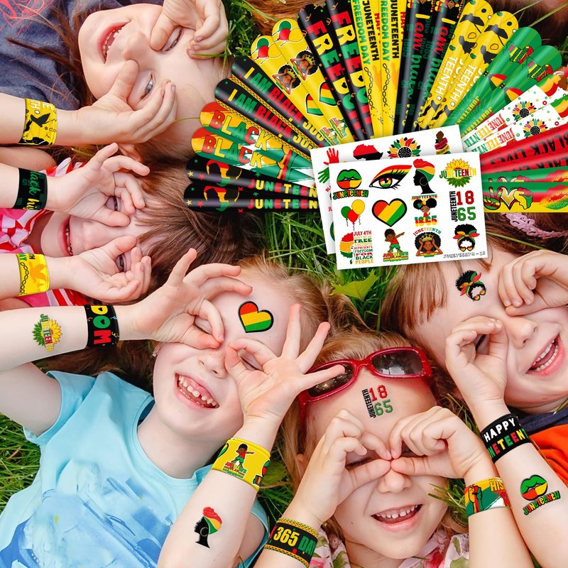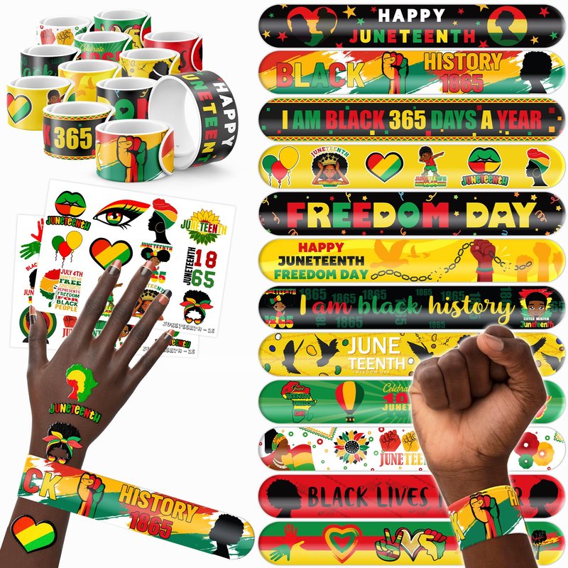 - šćPERFECT GIFT FOR JUNETEENTH ENTHUSIASTSć: Our Juneteenth Temporary Tattoos and Slap Bracelets are the perfect gift for individuals celebrating Juneteenth, from young enthusiasts to seasoned celebrators. Suitable for any Juneteenth event, they offer an affordable and spirited option. Whether for community gatherings, cultural festivals, or as a thoughtful gesture, this Juneteenth themed collection adds a fashionable and celebratory element to anyone's accessory collection, invoking joy and cherished memories.