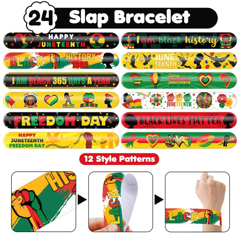 - šćVERSATILE AND PORTABLEć: Take the joy of Juneteenth with you wherever you go with our versatile slap bracelets. Their compact and lightweight design allows for easy carrying in your pocket, purse, or backpack. Whether at community events, parades, or Juneteenth festivities, wearing them instantly adds a festive and fashionable touch to your outfit. With their vibrant colors and dynamic appeal, these bracelets are sure to spread joy and smiles wherever you go. Get ready to celebrate!
