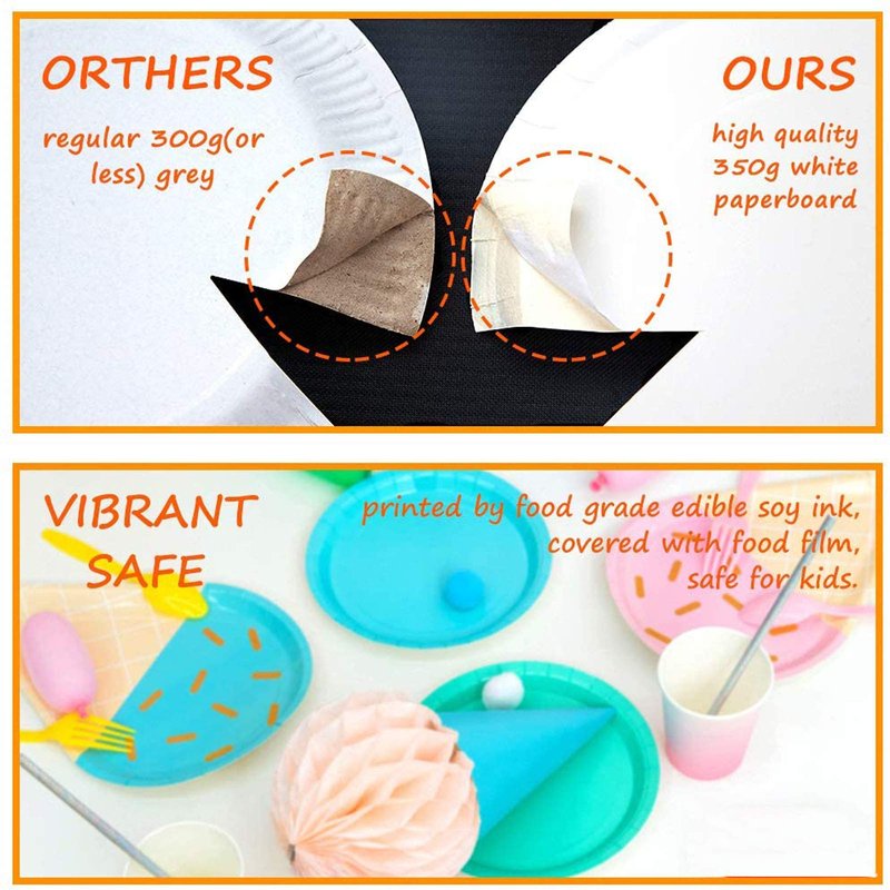 - Ice cream plates with a cute design, comes with 6 colors, 48 pack in total, which will be your kids favorite birthday party favors.