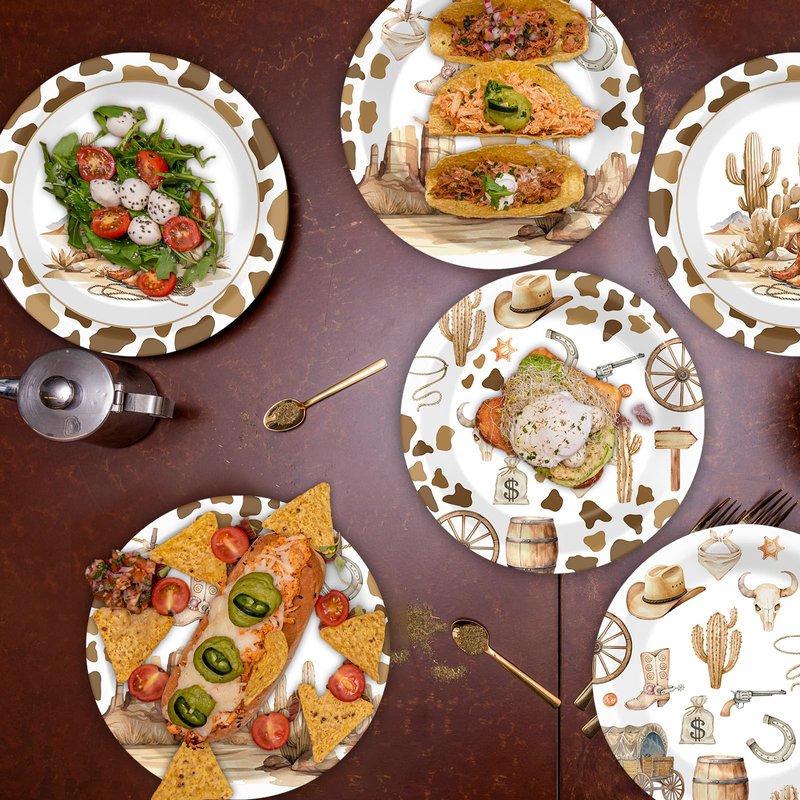 - Western Party Supplies: our wild west dinner plates are designed with classic western patterns such as cowboy hats, boots and horseshoes, cactus, etc., which will add a western cowboy atmosphere to your party.