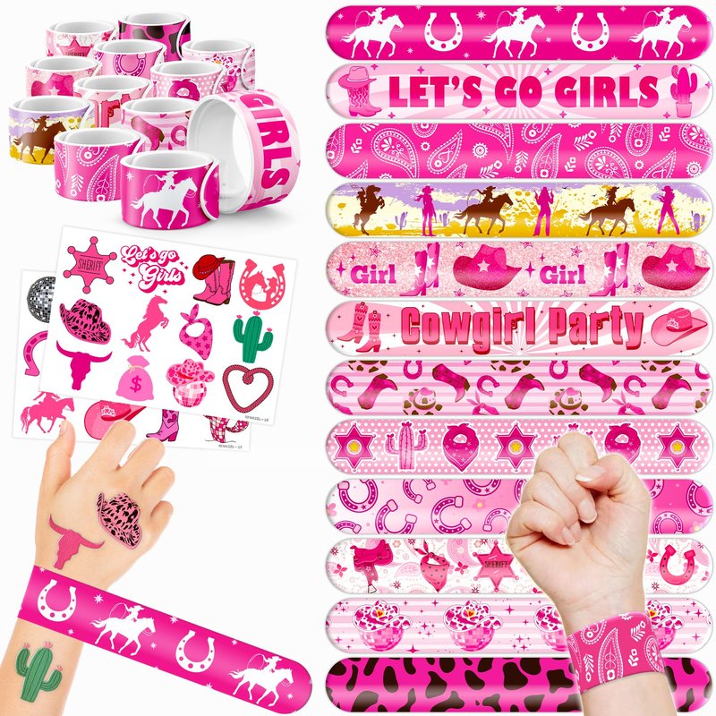 š„³ćDELIGHTFUL WESTERN COWGIRL PARTY FAVORS BUNDLEć: Get ready for laughter with our set of 24 temporary tattoo stickers and 24 slap bracelets. Each piece showcases vibrant and adorable designs inspired by the Western Cowgirl theme. Perfect for both kids and adults, this bundle ensures endless fun. The bracelets measure 23.5cm x 3.3cm, providing a satisfying "slapping" experience as they effortlessly wrap around your wrist. šæćDURABLE AND COMFORTABLEć: Constructed from high-quality materials, our slap bracelets are built to withstand wear and tear. The sturdy metal core is encased in soft PVC, ensuring safety, comfort, and longevity. With a smooth surface and no sharp edges, these bracelets offer a gentle and enjoyable feeling on your skin. Designed for daily use, they maintain their vivid colors and shape, adding a charming and nostalgic touch to your accessory collection. šćEFFORTLESSLY STYLISHć: Embrace the simplicity and trendiness of wearing our slap bracelets. With just a gentle "slap," they wrap around your wrist effortlessly, creating a comfortable and stylish look. Lightweight and comfortable for extended wear, they're perfect for parties, special occasions, or everyday fashion. These accessories bring a playful charm to any gathering, capturing the joyful spirit of the Western Cowgirl theme. Let the festivities begin! šæćVERSATILE AND PORTABLEć: Take the fun with you wherever you go with our versatile slap bracelets. Their compact and lightweight design allows for easy carrying in your pocket, purse, or backpack. Whether at school, work, or social gatherings, wearing them instantly adds a lively and fashionable touch to your outfit. With their playful and nostalgic appeal, these bracelets are sure to attract attention and bring smiles wherever you venture. Get ready! šćPERFECT GIFT FOR WESTERN COWGIRL ENTHUSIASTSć: Our Western Cowgirl Temporary Tattoos and Slap Bracelets are the perfect gift for people of all ages, from kids to adults. Suitable for any occasion, they offer an affordable and delightful option. Whether for school events, birthdays, or stocking stuffers, this Western Cowgirl themed collection adds a fashionable and nostalgic element to anyone's accessory collection, invoking happiness and cherished memories.