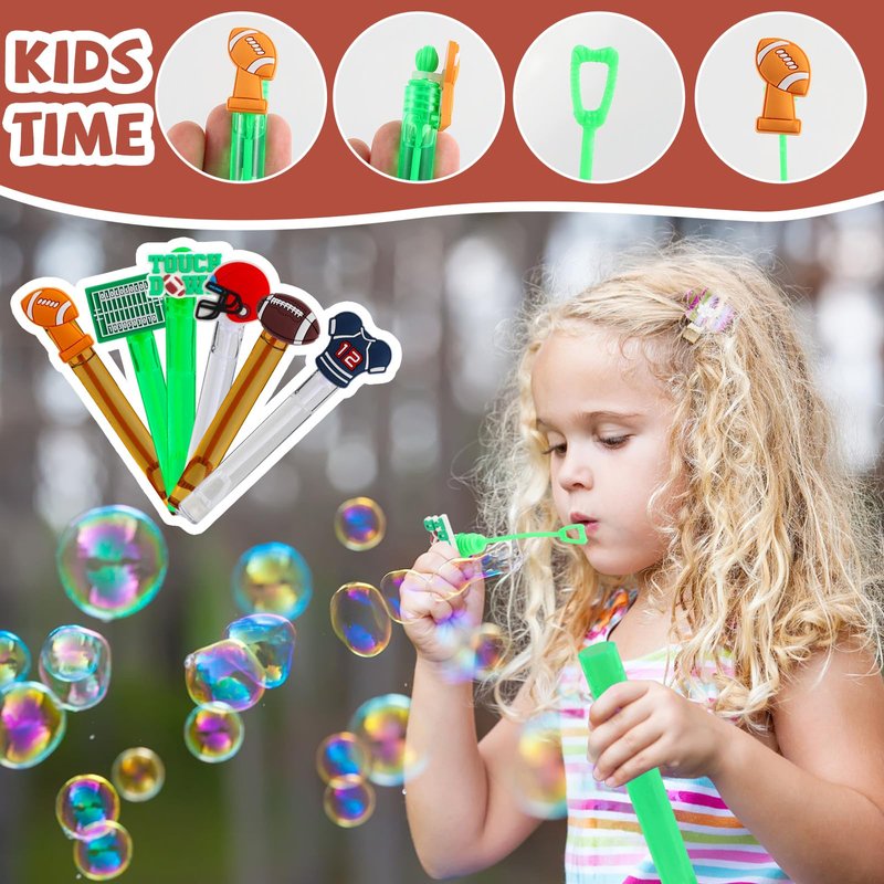 Football design: our mini bubble wands come in 6 different designs,8 pieces of each style,they are designed with football elements in the top of bubble wands,such as football, helmet, mini scoreboard and so on,creative design styles and rich color choices can meet the discerning needs of children