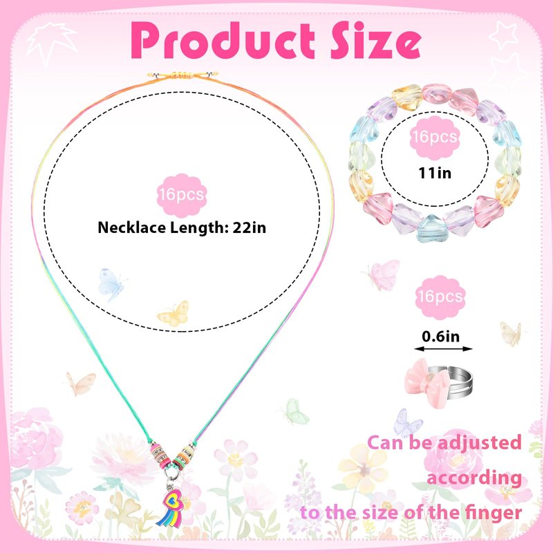 - What Can You Get: 48 pieces kids girls jewelry sets, including 16 necklaces and 16 bracelets and 16 rings of different styles; The exquisite combination and sufficient quantity is enough to meet girls daily matching