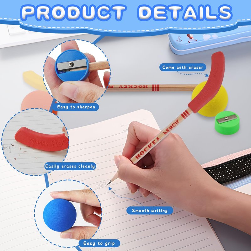 - Hockey Themed Design: this hockey pencils is equipped with various colors of erasers, together like a real hockey stick, with these soft foam hockey balls can start a "hockey game" with friends on the table, smooth rolling, appropriate bounce, perfect for indoor entertainment, ensuring the integration of pleasure and performance